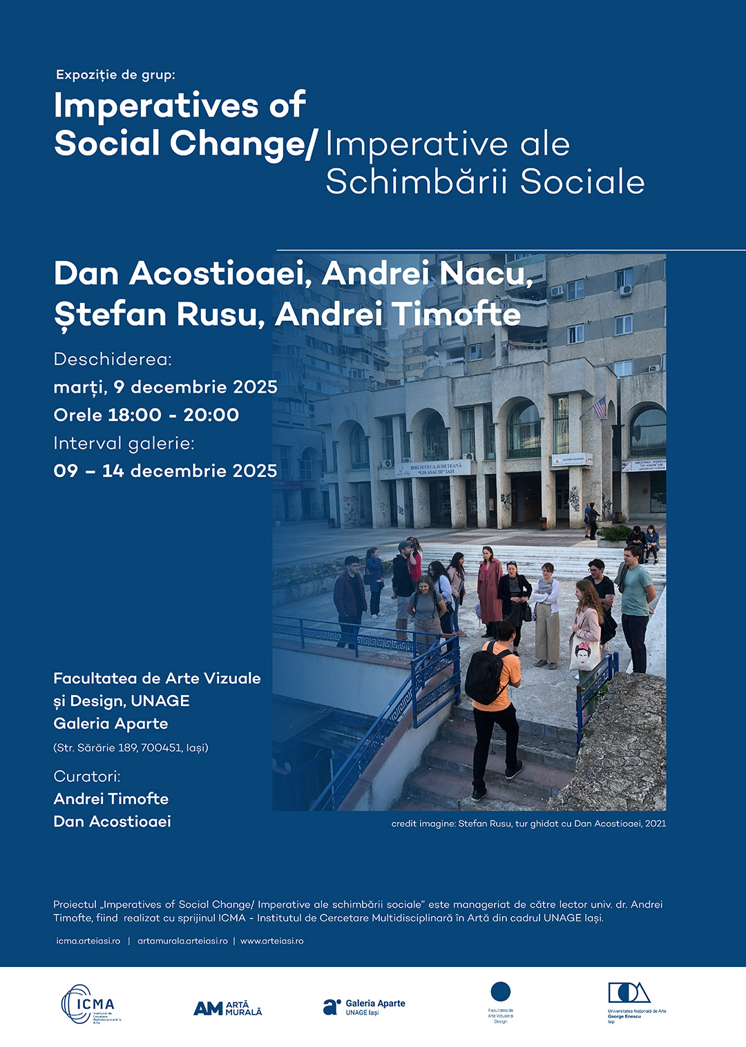 Expoziția Imperative ale schimbării sociale aduce în prim-plan capacitatea artei de a genera dialog, coeziune și schimbare socială într-o perioadă istorică marcată de crize și dezechilibre umanitare. Demersul artistic s-a articulat prin activități didactice, de cercetare și de creație, concentrate asupra necesității consolidării gândirii critice și analitice, a recuperării spațiului urban, a practicilor colaborative și a capacității umaniste de transformare socială prin artă, orientate spre imaginarea unui viitor solidar. În cadrul acestui demers colaborativ, artiștii Dan Acostioaei, Andrei Nacu, Ștefan Rusu și Andrei Timofte au cartografiat potențialul critic al artei de a provoca schimbări sociale, de a recupera istorii comune, de a interoga politicile producției de discurs și imagine, de a susține democratizarea spațiului public și de a (re)consolida libertatea academică, înțeleasă drept imperativ al criticii instituționale. Întrebarea care traversează acest proiect este: cum se manifestă schimbarea socială în practicile artistice și în cele de cercetare asupra comunului?