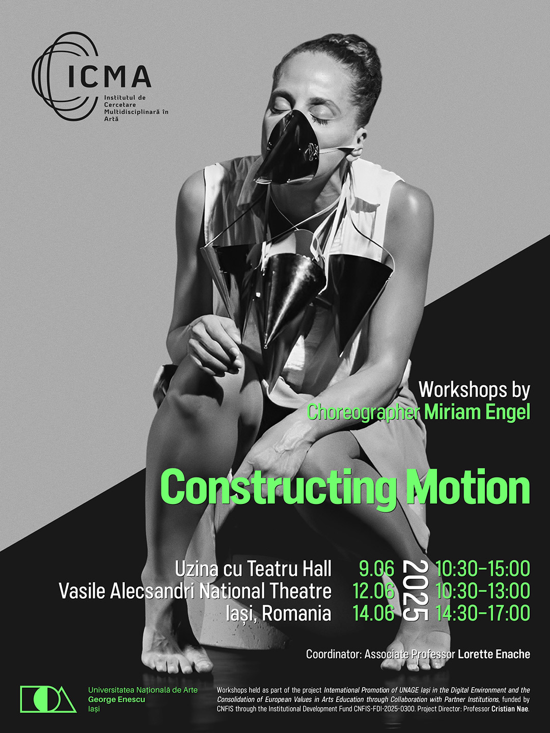 Specializarea Artele Spectacolului – Coregrafie din cadrul Facultății de Teatru a Universității Naționale de Arte „George Enescu” din Iași (UNAGE Iași) a organizat, în parteneriat cu Institutul de Cercetare Multidisciplinară în Artă (ICMA), în perioada 9–14 iunie 2025, în sala Uzina cu Teatru a Teatrului Național „Vasile Alecsandri” din Iași, atelierele Constructing Motion (Construcția mișcării) susținute de coregrafa Miriam Engel.